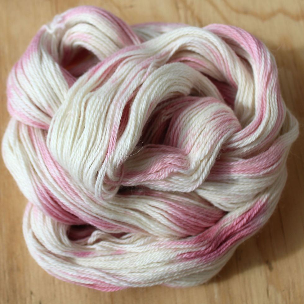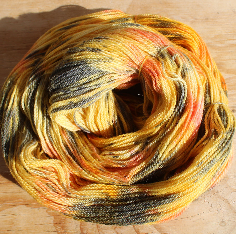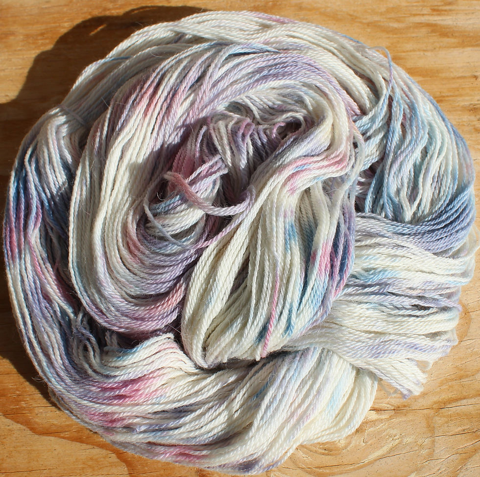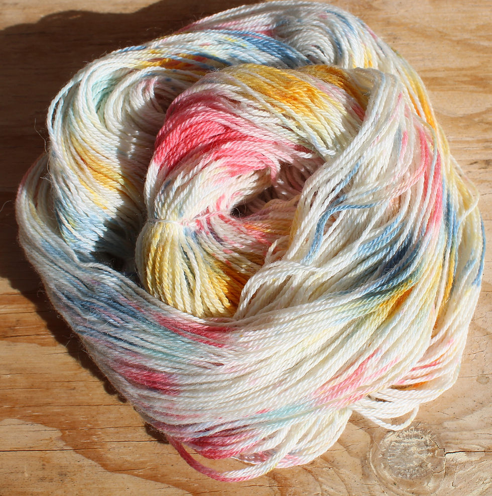 Mix and match hand dyed colours. Imagine the creations you can make with these colours. Skeins are 100gram approx. (360m). Correct tension stocking stitch 30 st /10cm. 3-3.5 mm recommended.